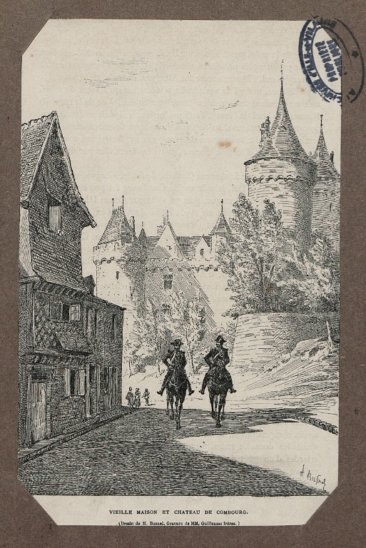 Légende :Deux cavaliers remontant la rue de la Beurrerie avec le château en arrière plan et une maison en pan de bois à gauche